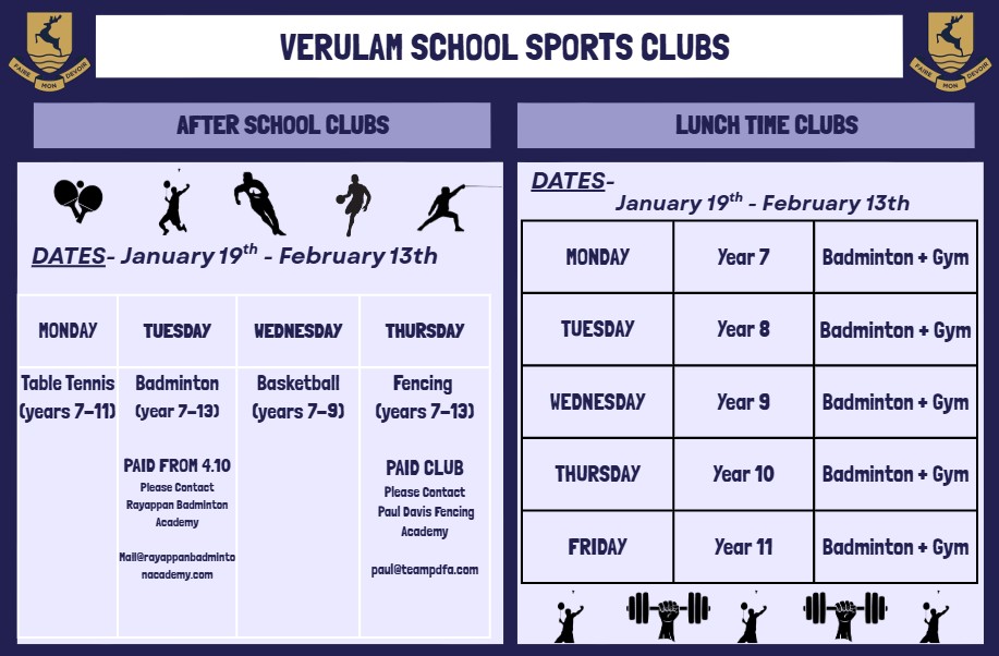 Note that sports clubs will start from 19th January, after the conclusion of year 13 mock exams that are using the sports hall.