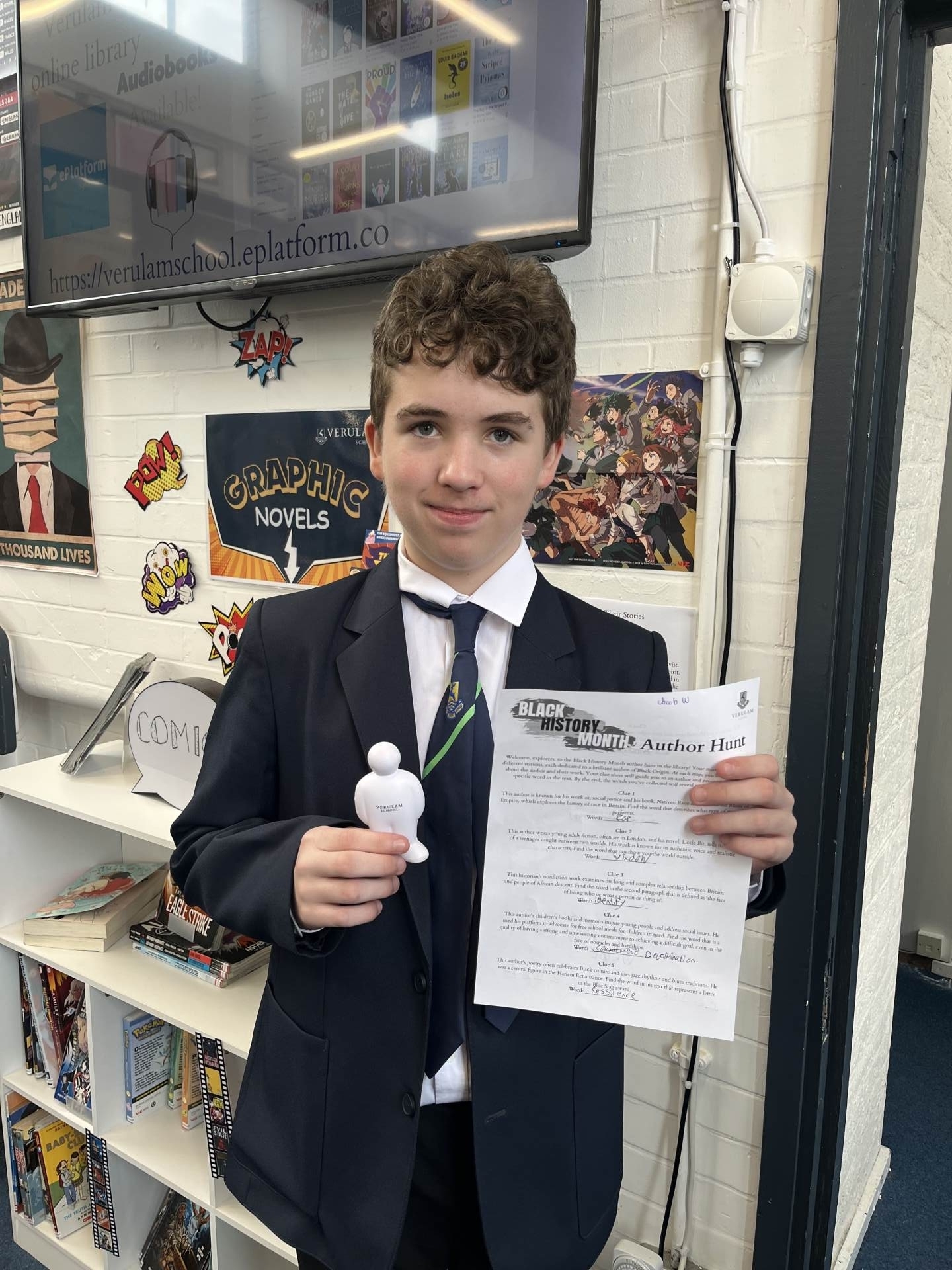 This October, the library celebrated Black History Month with a Reading Challenge and an Author Hunt. Students used their detective skills to follow clues around the library, searching for posters of authors of Black origin and deciphering hidden words within the texts.