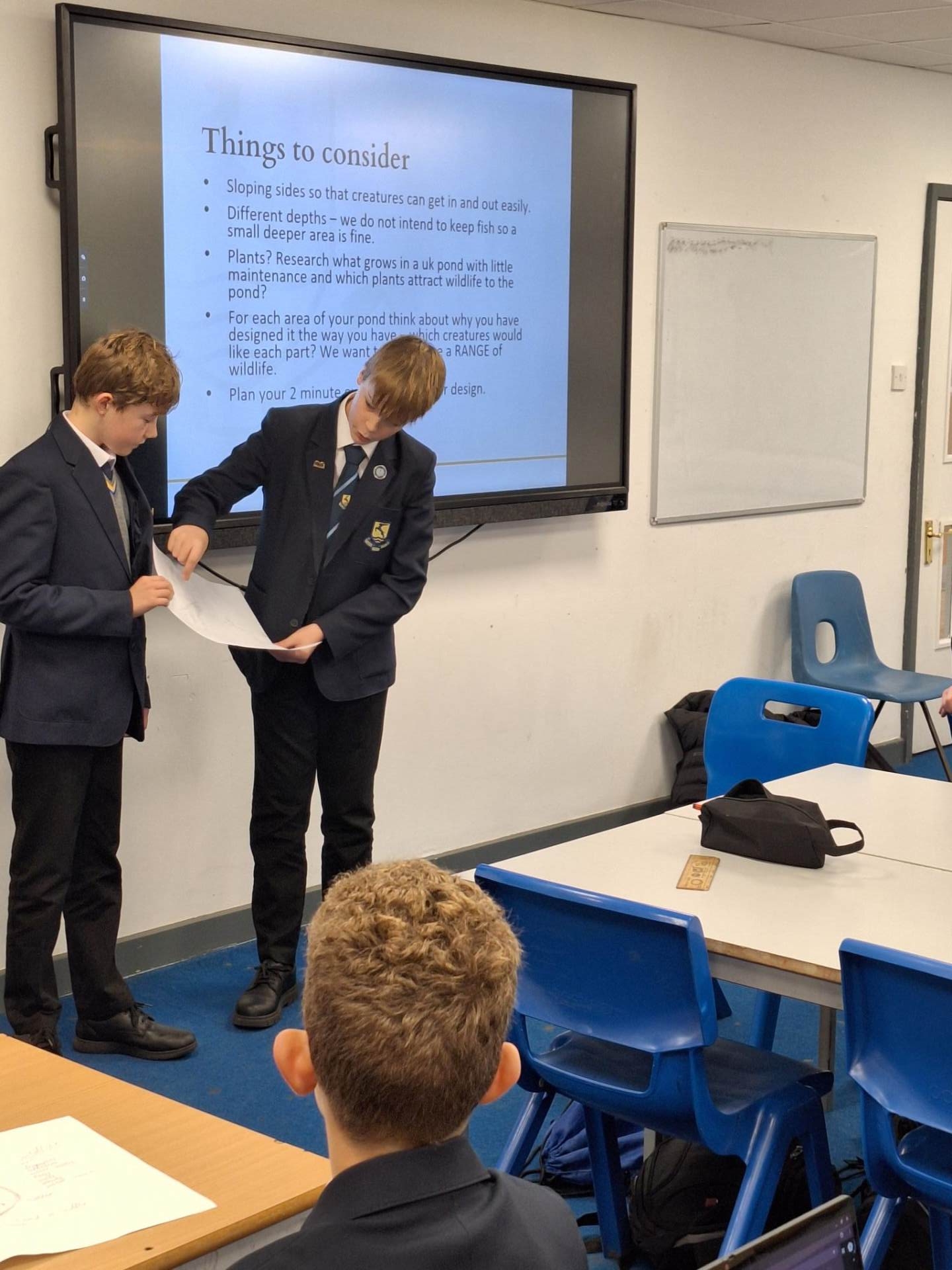 During Eco Council meetings in October we have been researching pond design and planting. Students in pairs, presented their design ideas and Basil Dredge, the other of our Senior Prefect Eco Council leaders, made careful notes of the best elements of each design after discussion with the whole group. Basil will now combine the best of each idea to form one pond design and this will then be presented back to the group for feedback – this project will be truly inclusive and a credit to all involved. In designing the pond, students have considered the following: